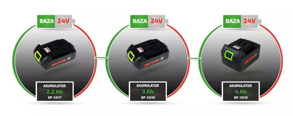 Акумулятор 3,0 Ач для інструментів на 24 В Акумулятор для акумуляторних інструментів Потужність: 24 В Акумулятор: 3 Ач, літій-іонний Час зарядки: 2-3 години Зарядні пристрої, які підходять для цього акумулятора: Зарядний пристрій на 24 V модель BP-5840 Швидкозарядний пристрій для двох акумуляторів модель BP-5841 Зарядний пристрій 24В 1.8А модель BP-5842 Інструменти BASS POLSKA, сумісні з цим акумулятором: Тример для живоплоту, 24 В, модель BP-8479 Бензопила 24 вольта модель BP-8320 Тример на 24 вольти модель BP-8474 Повітродувка 24 В, модель BP-8468 Повітродувка 24 В, модель BP-8469 Повітродувка 24 В, модель BP-8465 УШМ 24В модель ВР-5814