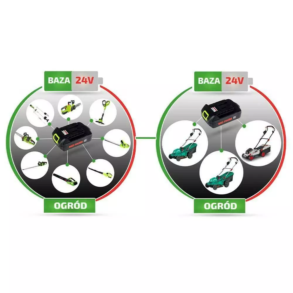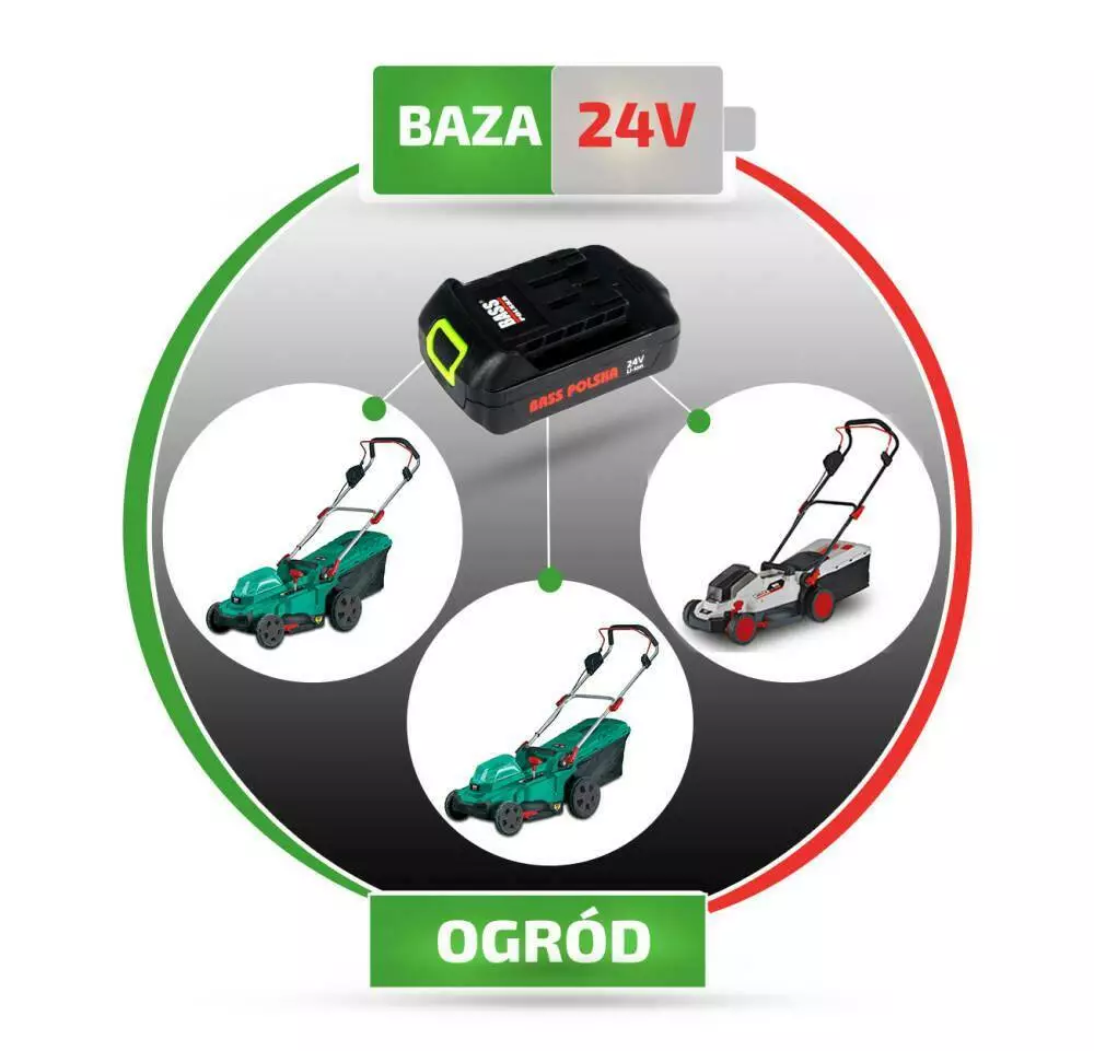 Акумуляторна косарка 2 x 24 В, 450 мм, для двох акумуляторів Акумуляторна газонокосарка Без акумуляторів та зарядного пристрою Напруга: 48 В (2 х 24 В) Потужність: Е3000 Швидкість без навантаження: 2900 об/хв Переднє/задне колесо: 7"/10" ширина різу: 450 мм Висота зрізу: 25 - 75 мм, шість рівнів Час роботи та площа скошування: 60 хв, 900 м² (для 2 акумуляторів 24 В 4000 мАг) Об'єм травозбірника: 50 л Відповідні акумулятори: BP-5837, BP-5838, BP-5839 - в комплект не входять Переваги газонокосарки BASS POLSKA Ця косарка відноситься до бази 24V Base - інструменти, що працюють від одного акумулятора. Акумуляторна косарка Bass Polska стане найкращим вибором, якщо ви є власником великої ділянки, саду або великого газону. Відсутність електричного кабелю, можливість тривалої безперервної роботи та ширина скошування 450 мм роблять цю косарку ідеальним обладнанням для скошування великих площ. Легка акумуляторна косарка інтуїтивно зрозуміла у використанні та проста в управлінні. Акумуляторна газонокосарка не виділяє шкідливих речовин і не завдає шкоди навколишньому середовищу. Двигун із низьким рівнем шуму. Корпус стійкий до садових перешкод. Місткий кошик для скошеної трави, який можна швидко зняти і знову встановити. Можливість налаштування робочого положення відповідно до уподобань користувача. Профільована ручка із губкою для зручної роботи. Висота скошування трави встановлюється централізовано та регулюється по шести рівнях. Захисний вимикач запобігає випадковому включенню. Чому цей BASS POLSKA без акумулятора та зарядного пристрою в комплекті? База 24 В це акумуляторні інструменти Bass Polska, що працюють від однієї батареї. Наша остання серія акумуляторних інструментів для майстерні та саду відрізняється можливістю живлення кожного інструменту від того самого акумулятора з тривалим терміном служби. Акумулятор і зарядний пристрій для шабельної пилки ви купуєте окремо, що виявиться для вас оптимальним рішенням, якщо ви тільки розширюєте свій набір садового інструменту або комплектуєте обладнання для майстерні. Що Ви отримуєте, вибираючи безліч інструментів та один акумулятор? Професіоналізм – найвища якість виробництва кожного інструменту серії, створеної для вимогливих користувачів. Налаштуйте інструмент під свої вимоги - у міру зростання ваших вимог зростає колекція інструментів. Широкий вибір інструментів цієї серії дозволяє створити набір інструментів, який на 100% підійде саме вам. Економія - вам більше не потрібно купувати кілька акумуляторів та зарядних пристроїв для більшої кількості інструментів. Ви заощаджуєте не тільки гроші, а й місце в будинку чи майстерні!