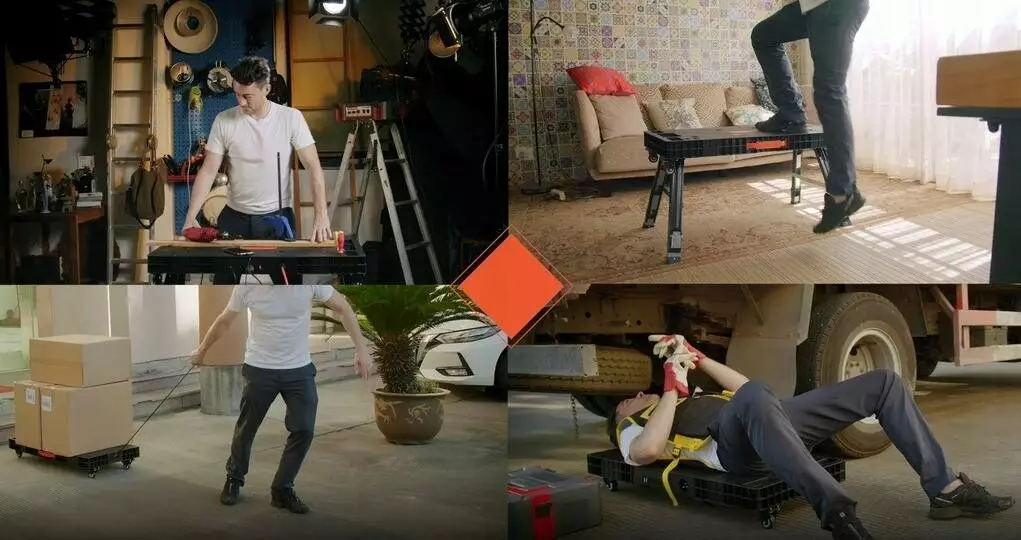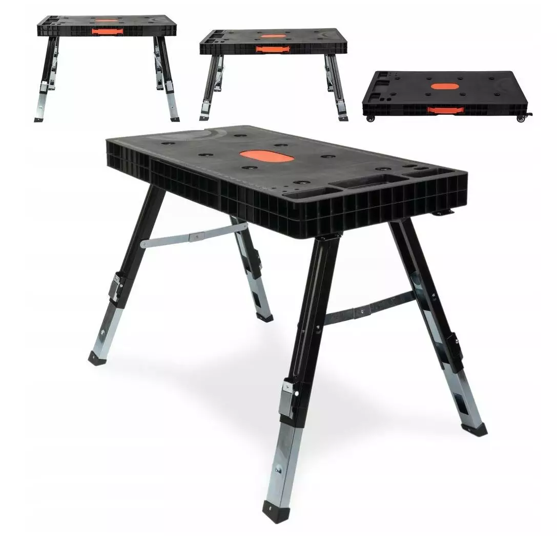 Складний робочий стіл 5 в 1 є універсальним виробом і може використовуватися як: робочий стіл, конструкція для вантажів, риштування, лежанка для майстерні або візок. Стіл можна легко перетворити між різними режимами, дотримуючись інструкції з експлуатації.