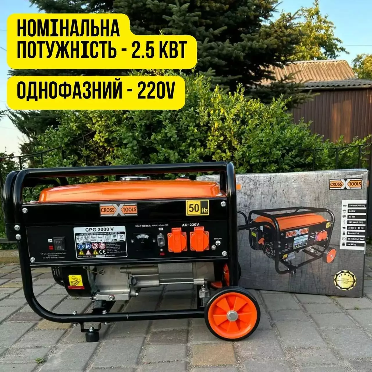 Бензиновий однофазний генератор Cross Tools CPG 3000 V 2.5 кВт + AVR з ручками та колесами