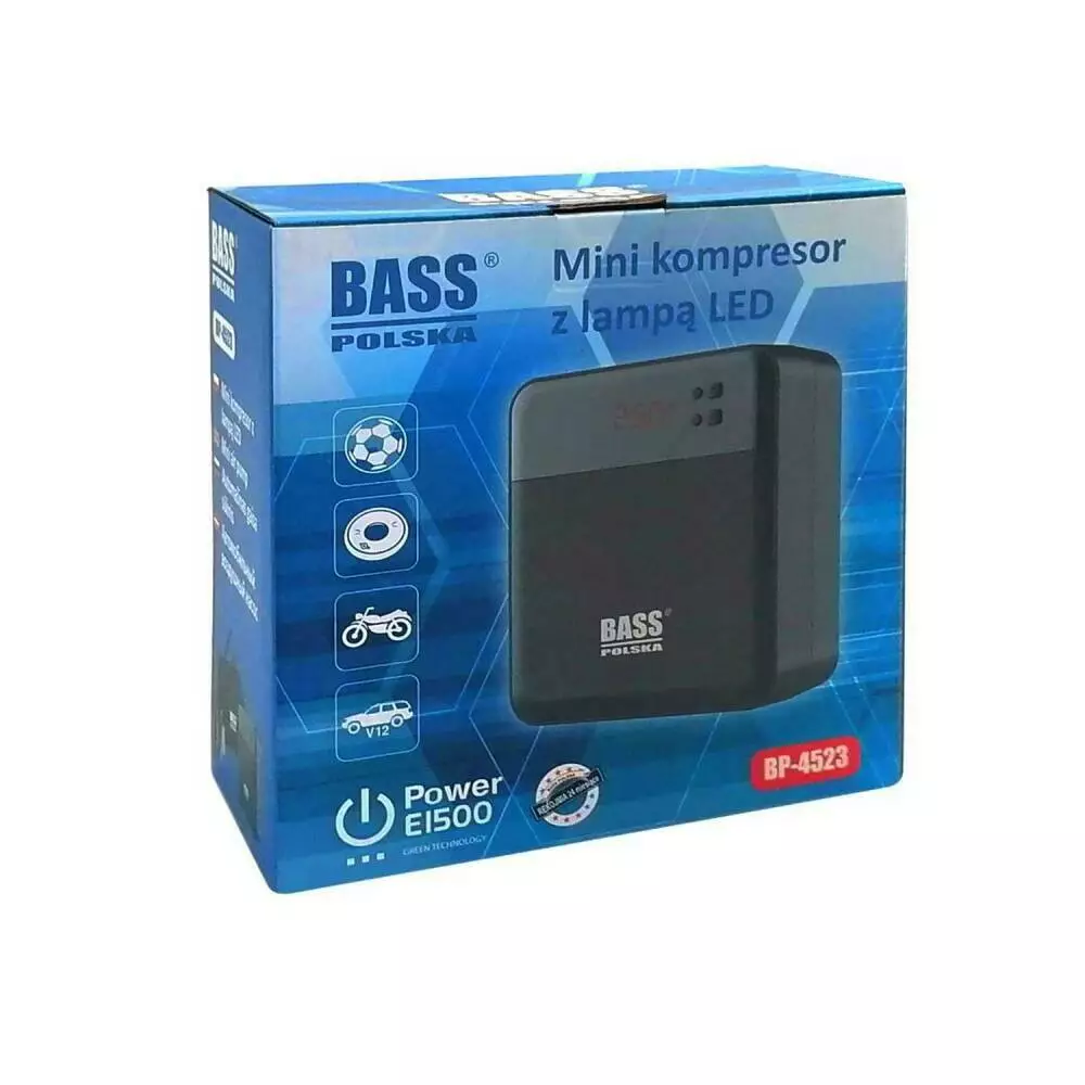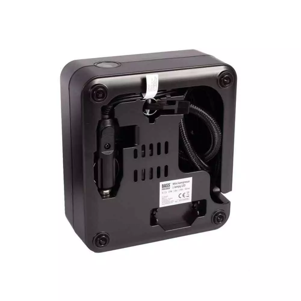 ПОРТАТИВНИЙ МІНІ КОМПРЕСОР ЗІ СВІТЛОДІОДНОЮ ЛАМПОЮ З НАБОРОМ ІНФЛЯЦІЙНИХ НАКІНЕЧИКІВ Напруга: 12 В постійного струму Потужність: 120 Вт Струм: 10А Тиск: 11 бар / 159 фунтів на кв. дюйм Потік повітряний: 30 л/хв Довжина шнура живлення: 300 см Довжина пневматичного шлангу: 50 см ПЕРЕВАГИ МАЛЕНЬКОГО ПОВІТРЯНОГО КОМПРЕСОРА BASS POLSKA Портативний компресор для накачування шин автомобілів, мотоциклів, велосипедів, мопедів, м'ячів, матраців, басейнів, іграшок. Компресор із живленням від гнізда прикурювача. Завдяки своїй компактній конструкції він поміститься у будь-який багажник. Для зручності користувача компресор оснащений світлодіодним підсвічуванням. Автомобільний компресор швидко та безпечно накачає шини перед поїздкою.