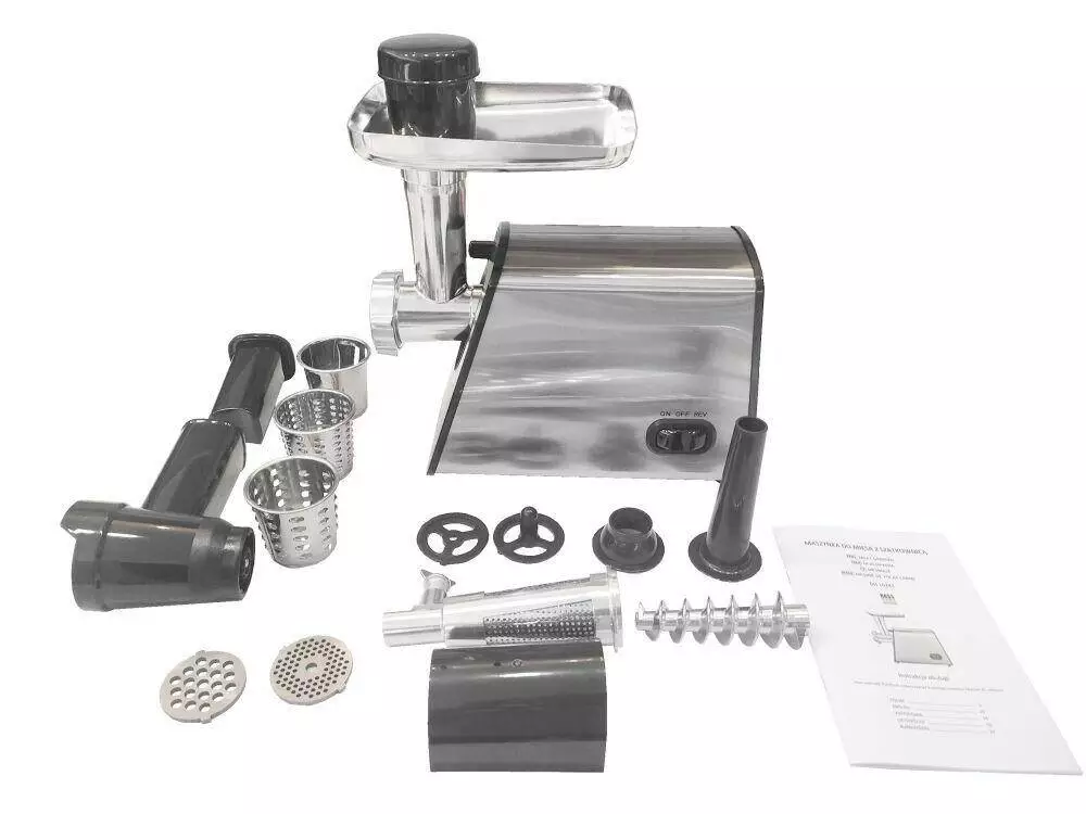 - Однією з ключових переваг цієї машини є можливість подрібнення м'яса завдяки трьом типам лез з нержавіючої сталі, які дозволяють нарізати м'ясо різної товщини. Крім того, машина оснащена штовхачем їжі, який полегшує введення інгредієнтів у пристрій.
