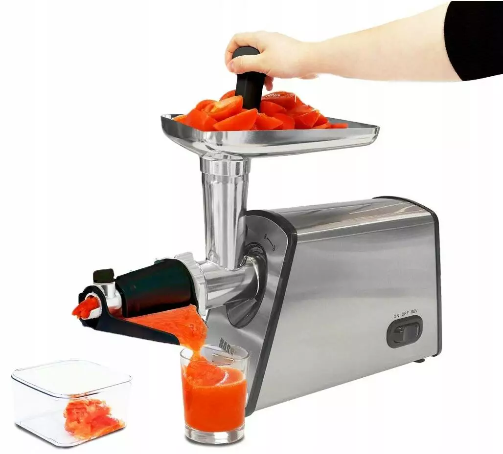 - Електром'ясорубка 6 в 1 зі слайсером призначена для різноманітних завдань, пов'язаних з приготуванням м'яса. Ця універсальна машина пропонує не тільки можливість подрібнювати м'ясо, але також нарізати, віджимати та фарширувати. Оснащена багатьма функціями, вона забезпечує надійність і зручність на кухні.