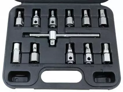 Набір головок для масляних пробок з хромованадієвої сталі, що відрізняється стійкістю до корозії, окислення та стирання.