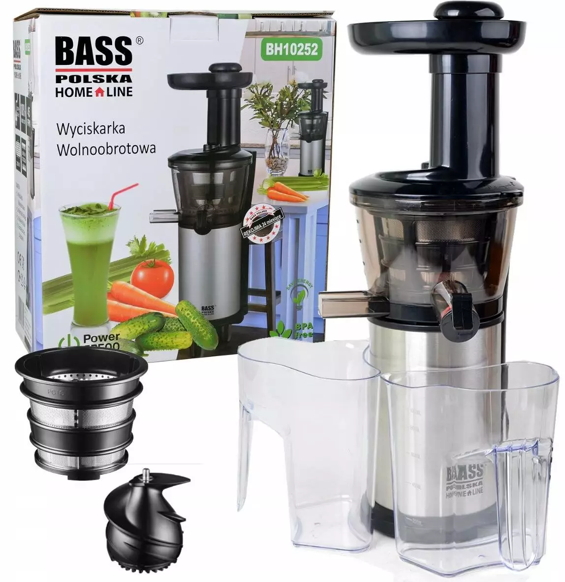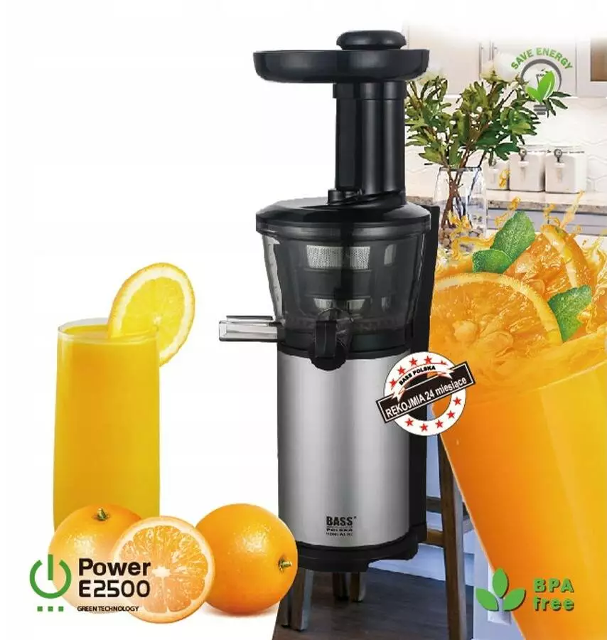 Низькооборотна соковижималка Bass Polska - це побутова техніка для кухні, якою нічим не здивуєш. Вкажіть на будь-який фрукт, будь-який овоч або траву! Наша соковижималка впорається з будь-яким завданням! Низькооборотний гвинт обертається зі швидкістю сорок п'ять обертів за хвилину. Він подрібнює інгредієнти, поступово вивільняючи з них усі вітаміни та корисні речовини. Що важливо, шнек не нагрівається під час вичавлювання соку. Повільна технологія вичавлює соки холодними, щоб сік мав якомога більше корисних властивостей. За допомогою шнекової соковижималки можна приготувати сік з твердих овочів і фруктів і навіть з листя кропиви! Не зволікай! Включіть у меню своєї родини корисний сік з буряка, селери чи горобини!