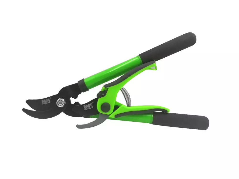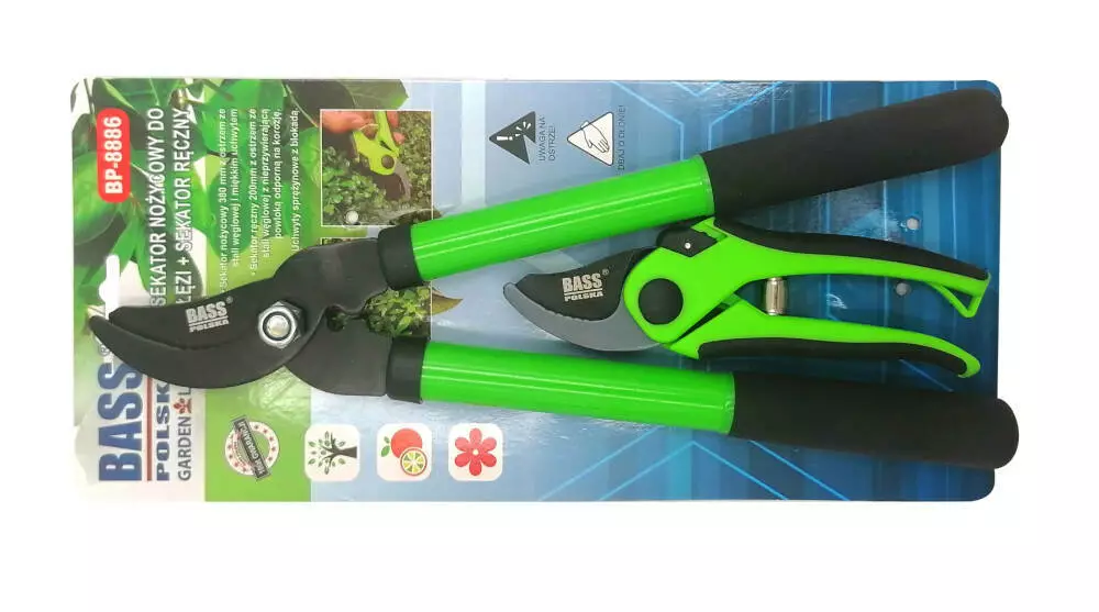 - Набір ручних садових інструментів Bass Polska, що складається з ножиць і коротких ручних секаторів.